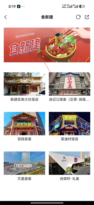 2、在食新建商家列表中選擇涂記江南宴正榮潤城店這一商家,點擊該商家,進入對應的商家詳情頁面。