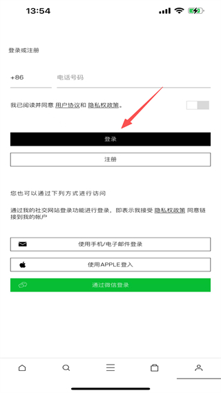 1、進入登錄頁面,可通過手機號碼完成登錄或注冊,也支持微信、Apple等社交賬號快捷登錄,需先勾選同意協議才能操作。
