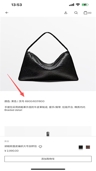 4、進入商品詳情頁,可查看包袋的顏色、貨號與材質信息,該款采用納帕牛皮革制成,支持添加購物車,便于后續購買。
