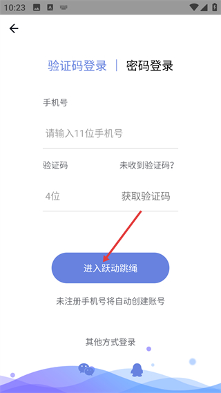 1、應用登錄頁支持驗證碼或密碼登錄,輸入11位手機號及4位驗證碼,點擊進入躍動跳繩,未注冊手機號會自動創建賬號。