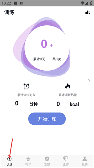 3、訓練頁展示跳繩數據統計,含個數時長熱量等信息,點擊開始訓練可啟動記錄,底部還有教學等功能入口輔助訓練。