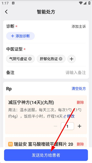 4、智能處方頁面,補充診斷、中醫證型等信息后,點擊發送處方給患者按鈕,完成處方的發送操作。