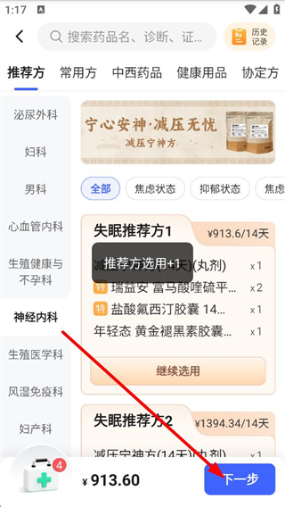 2、進入智能處方的推薦方頁面,左側有科室分類,選擇失眠推薦方1,點擊選用按鈕,選定該處方方案。