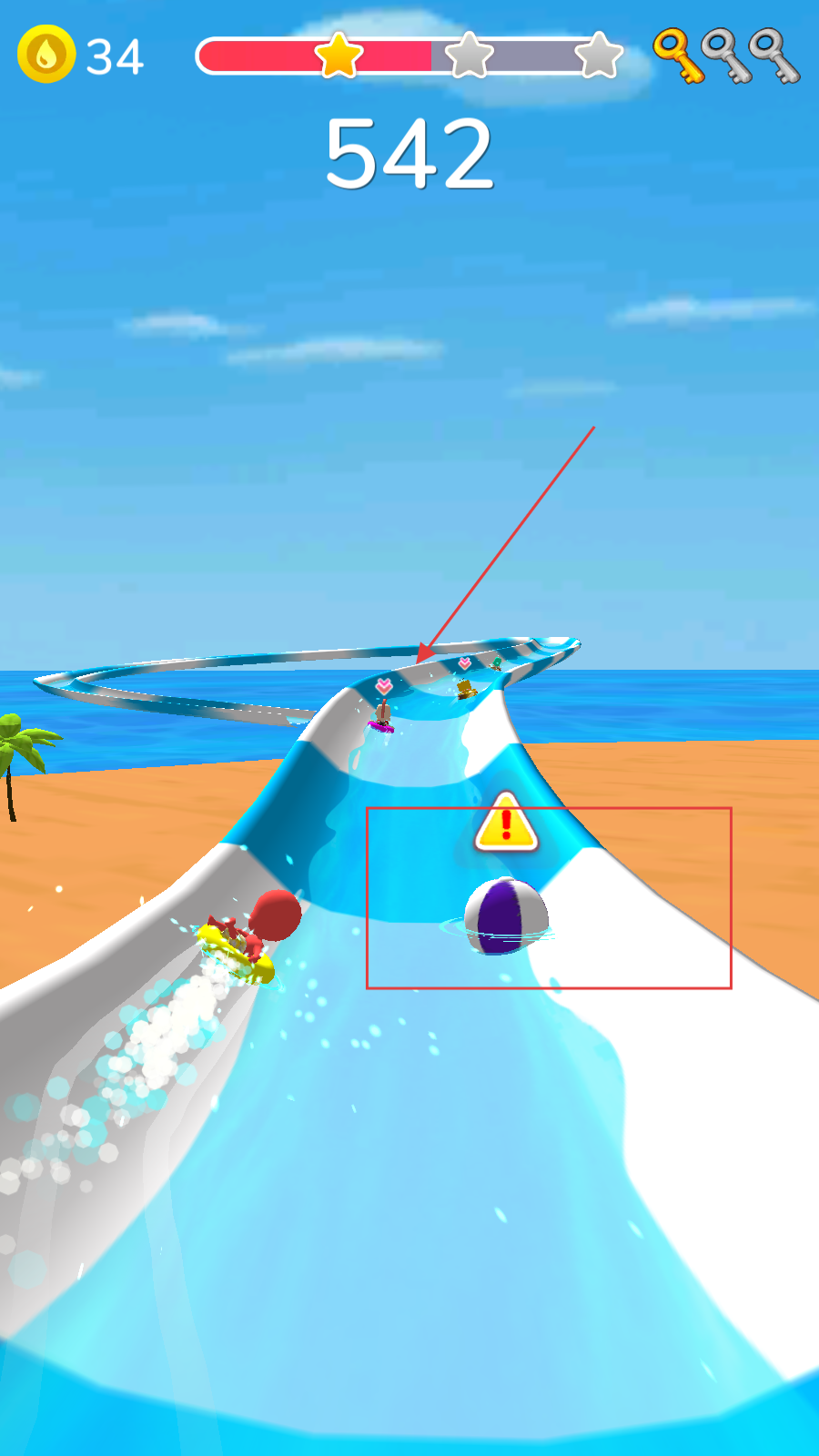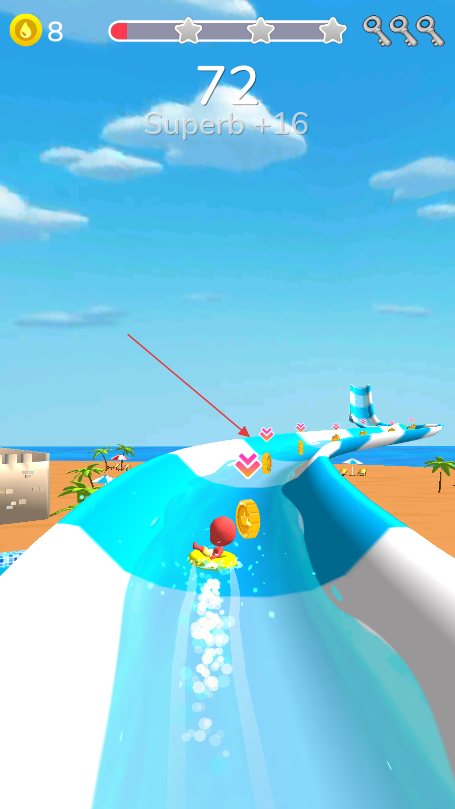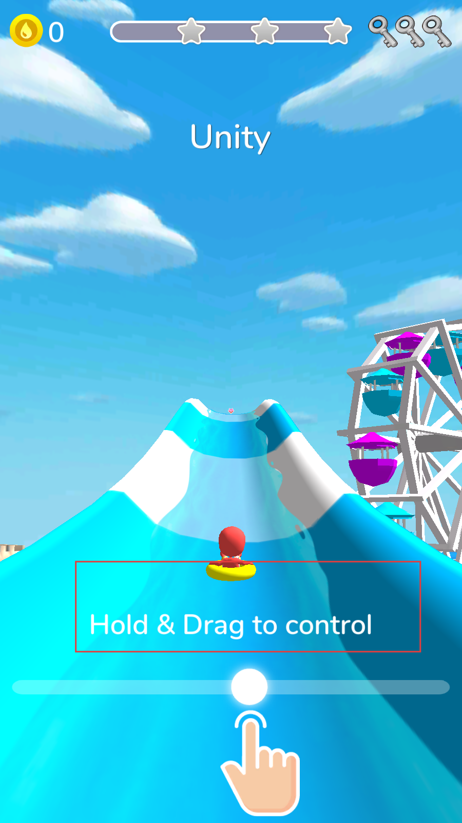 1、玩家在游戲界面通過按住并拖動的操作方式,控制角色乘坐的游泳圈開始在水上滑梯滑行開啟游戲。