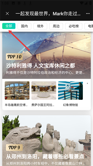 2、全部板塊涵蓋廣泛,有沙特利雅得人文景點,還有鄭州到洛陽的必看景點推薦,滿足不同旅行需求。