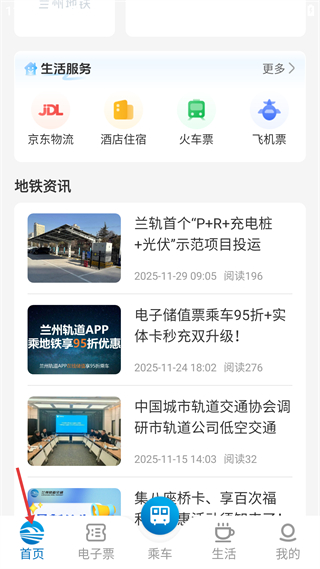 1、首頁整合京東物流、酒店等生活服務與地鐵資訊,可查看P+R示范項目、票務優惠等最新動態,是綜合服務入口。