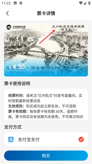 3、橋系列單程票以蘭州本地橋梁為主題,售價4.5元,需抖音直播間搶票,30天內有效且購買后不可退款。