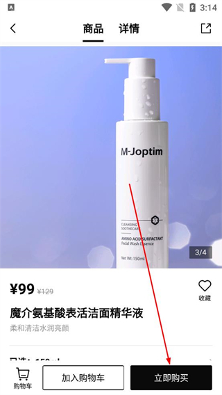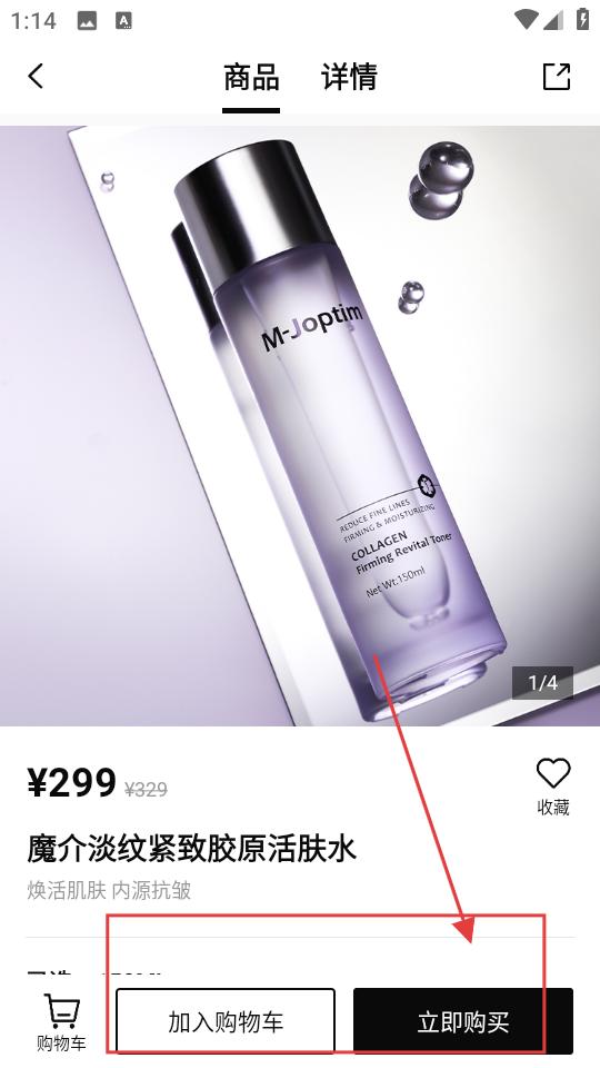 2、看到心儀商品,如魔介優選里的護膚品,點擊進入商品頁,查看詳情,選擇加入購物車或立即購買,完成下單。