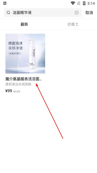 3、在潔面精華液的搜索結果頁查看展示的商品列表,選擇目標商品點擊進入其詳情頁面,查看商品的價格及功效介紹。