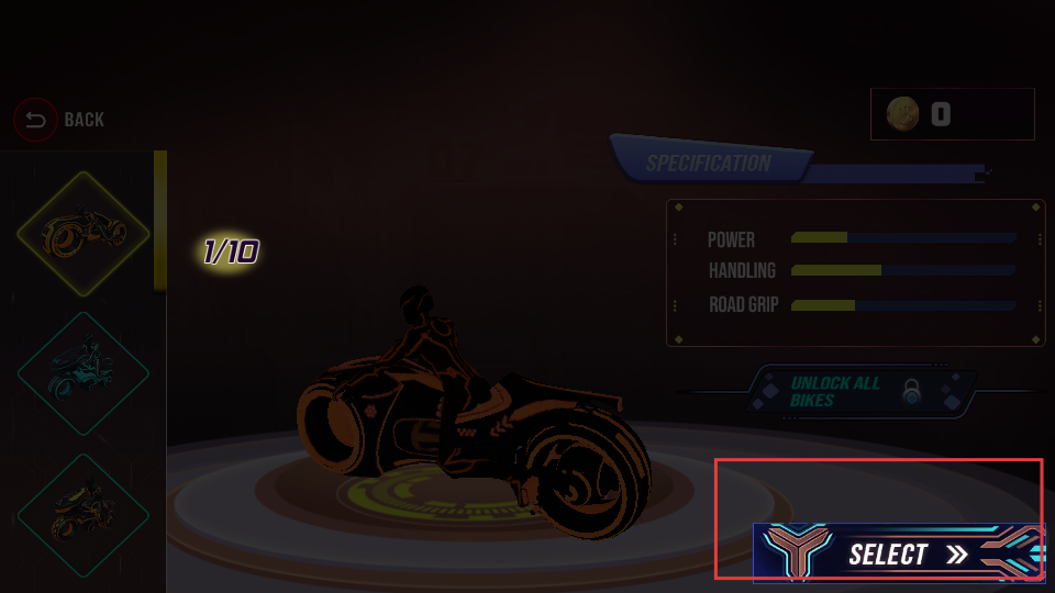 1、在車庫或選擇界面,瀏覽可使用的摩托車,點擊SELECT按鈕,選擇自己心儀的摩托車開始游戲。