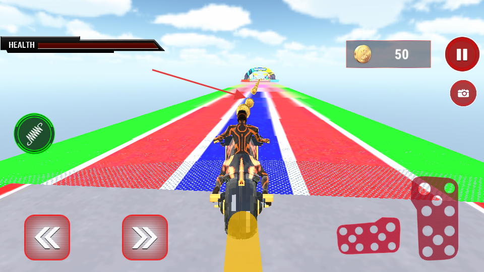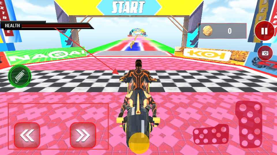 2、玩家進入賽道起始點,看到START標志后,通過屏幕右下角的加速按鈕啟動摩托車,開始在超級坡道上行駛。