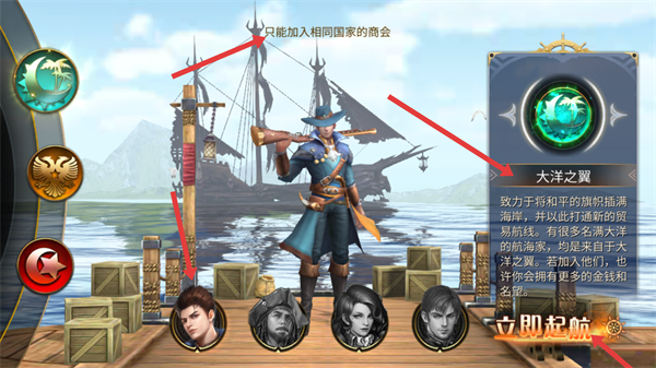 1、可選擇角色,加入相同國家的商會,還能選擇大洋之翼勢力,了解其致力于布滿海洋開拓貿易線的宗旨后立即起航。