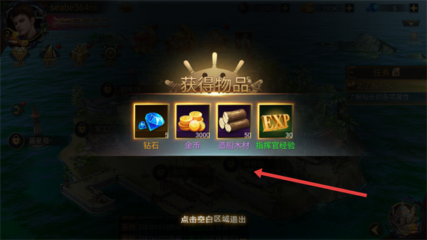 4、完成任務或探索后可獲得鉆石、金幣、造船木材、指揮官經驗等物品,點擊空白區域可退出獲得物品的界面,繼續游戲。
