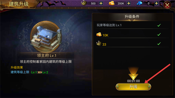 3、升級領主府時,需滿足玩家等級、金幣、木材等升級條件,點擊升級按鈕后等待升級時間結束,即可提升建筑等級上限。