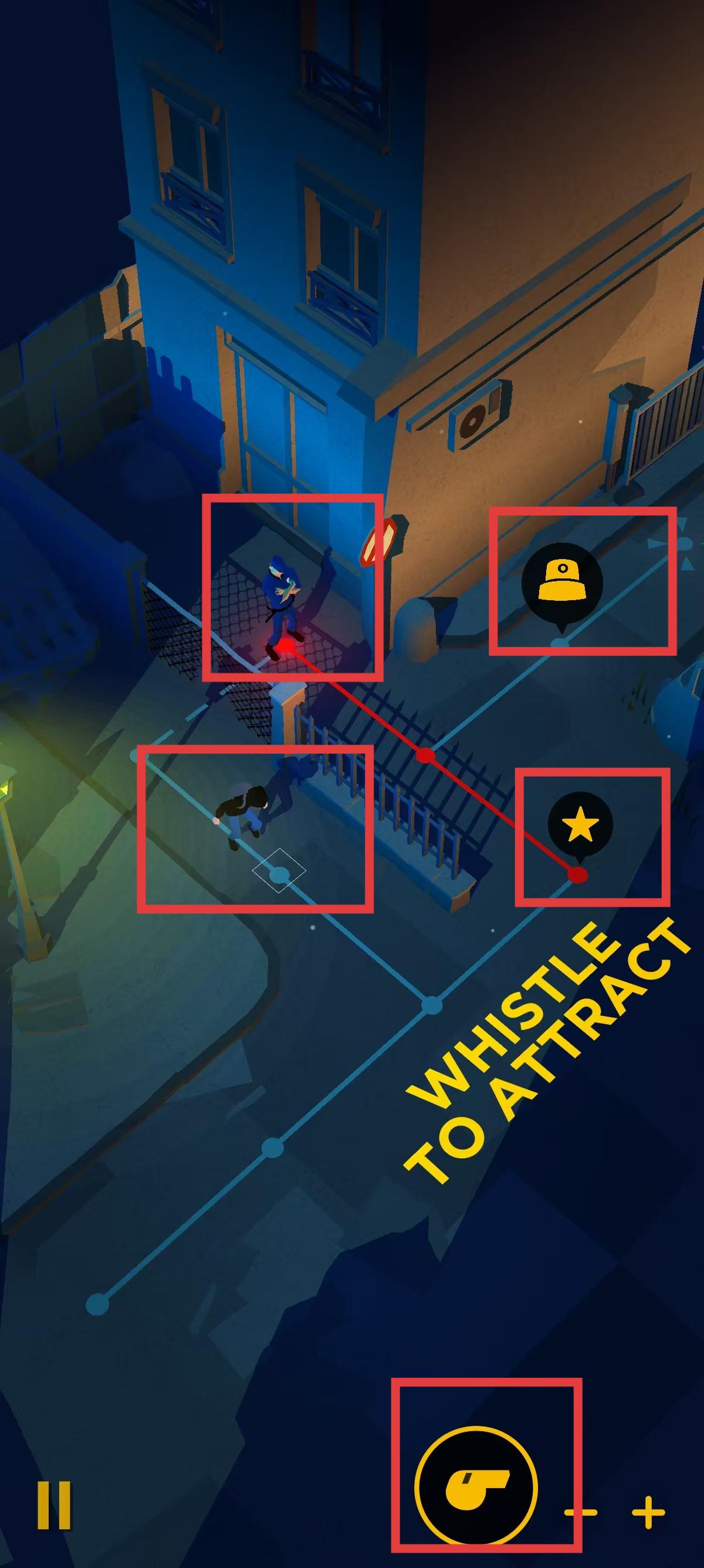 1、點擊屏幕開始游戲,進入游戲場景,操控角色在街道移動,避開警察視線,同時可利用道具吸引警察注意力。