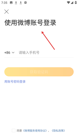 1、微博登錄板塊,支持手機號獲驗證碼登錄,也可賬號密碼登錄,需同意微博服務協議與隱私政策。