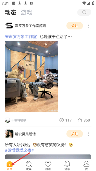 2、首頁板塊,分動態、游戲類,展示聲羅萬象、解說靈兒超話內容,含帖子互動數據,有關注功能入口。