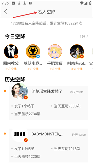 3、名人空降板塊,47288位名人累計空降超話超百萬次,今日圈內教父等空降,沈夢瑤等有歷史空降記錄。