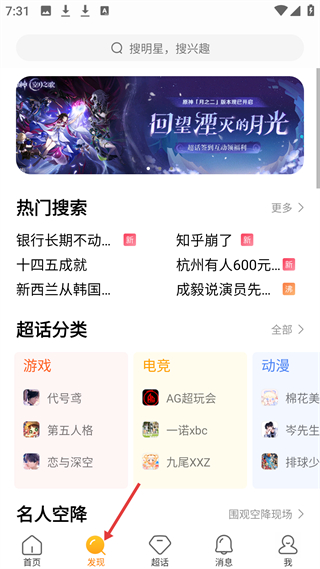 4、發現板塊,有搜索欄,展示熱門搜索和游戲、電競、動漫超話分類,含代號鳶等超話,有名人空降入口。
