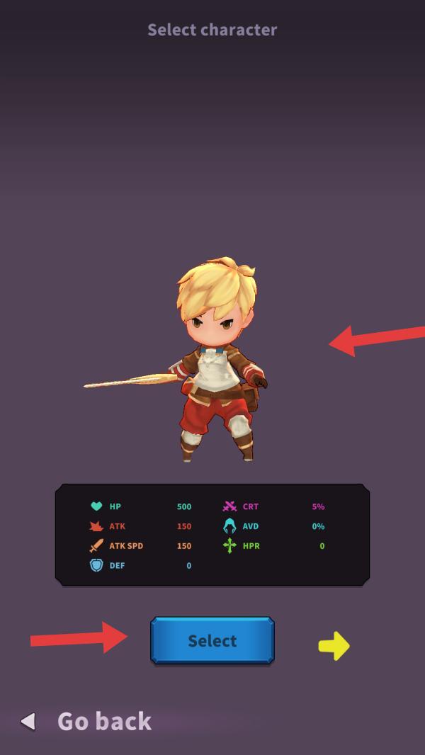 1、進入游戲先選擇角色,查看角色的HP,ATK等屬性,確認后點擊Select按鈕,選定角色開啟冒險。