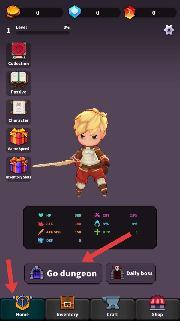 2、在主界面可查看金幣,鉆石等資源,還有Collection,Passive等功能選項,點擊Go dungeon進入地牢關卡選擇。