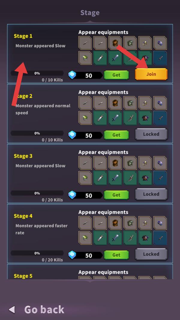 3、在選擇界面能看到不同Stage的怪物出現速度,可獲取裝備等信息,點擊Join加入可挑戰的Stage1。