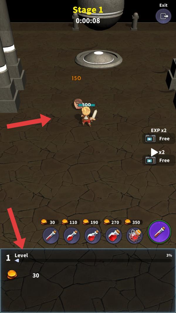 4、進入關卡后,操控角色到場景中移動,擊敗怪物獲取經驗提升等級,還能獲得金幣,可使用藥水等道具助力戰斗。