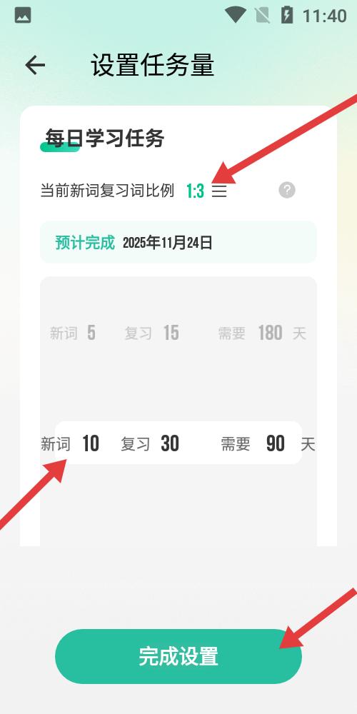 1、進入設置任務量界面,調整新詞與復習詞比例,設定新詞10、復習30,預計90天完成,確認后點擊完成設置,開啟學習計劃。