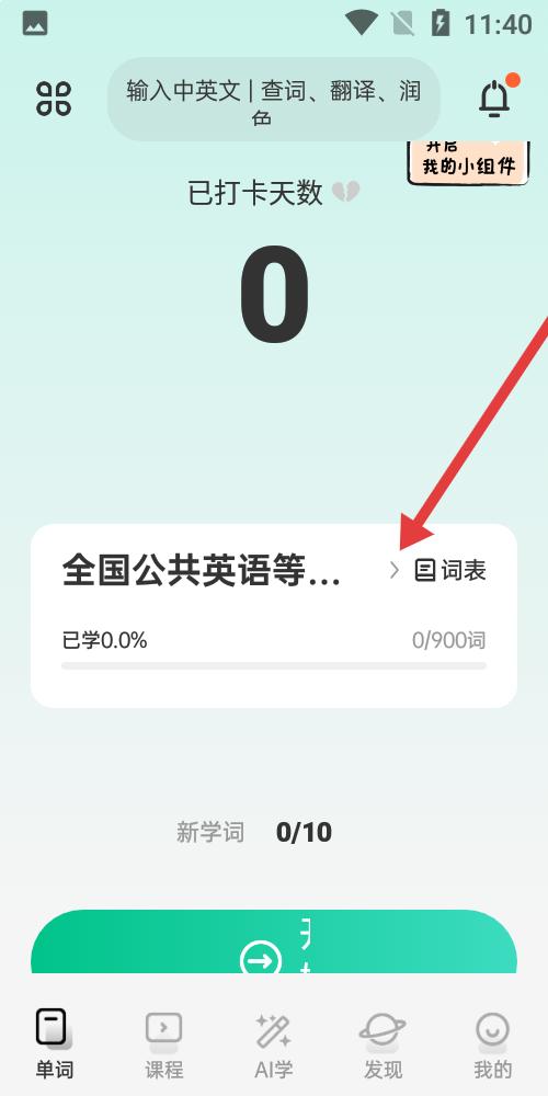 2、在單詞頁面選學習詞表,如全國公共英語等詞表,查看已學進度,依規劃開啟每日新學與復習任務。