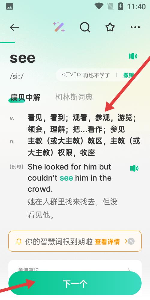 4、查看單詞釋義、例句了解用法,學完當前單詞點擊下一個,持續推進學習,逐步積累詞匯量。