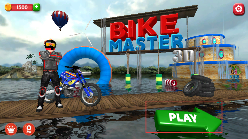 1、玩家在游戲主界面點擊PLAY綠色箭頭按鈕,進入花樣水上摩托3d游戲,開啟摩托騎行挑戰。