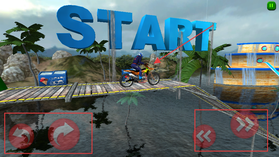 2、通過屏幕上的方向按鈕左右兩側的紅色轉向按鈕控制水上摩托的轉向,在水上賽道上調整行駛方向,躲避障礙物和陷阱。