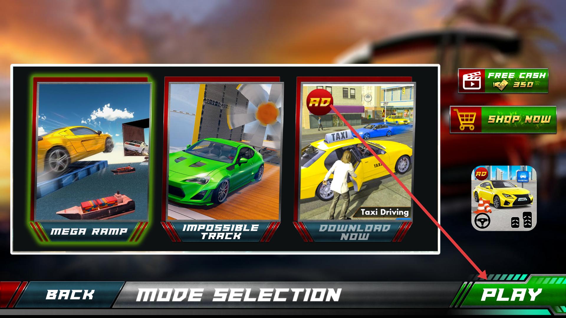 1、進入驚人的汽車特技游戲,在模式選擇界面點擊PLAY按鈕,進入游戲的第一關,此時能看到綠色賽車停在起始點前,準備開始賽車挑戰。