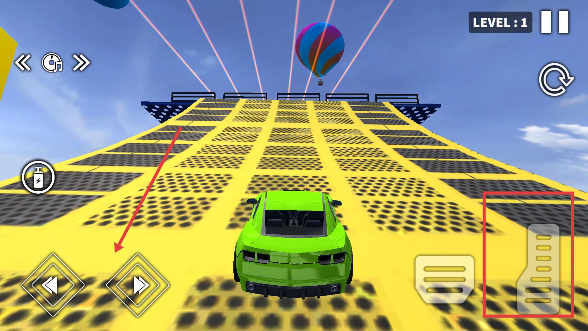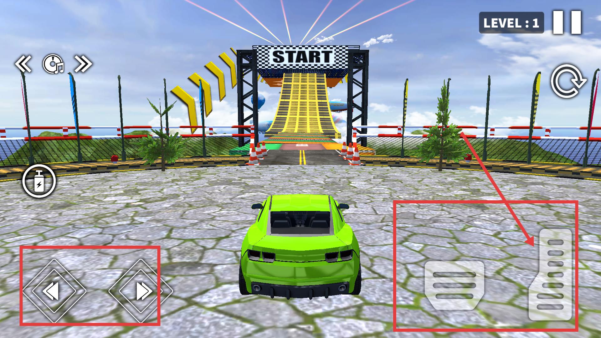 2、操控綠色賽車利用右側的油門按鍵加速,同時通過左側的方向按鍵調整賽車方向,朝著標有START的起始坡道前進,為沖上坡道做準備。