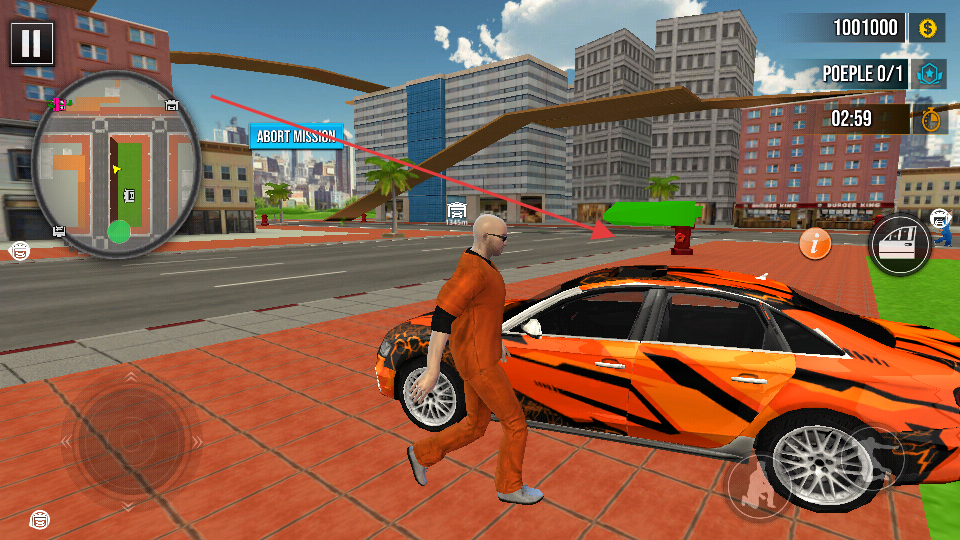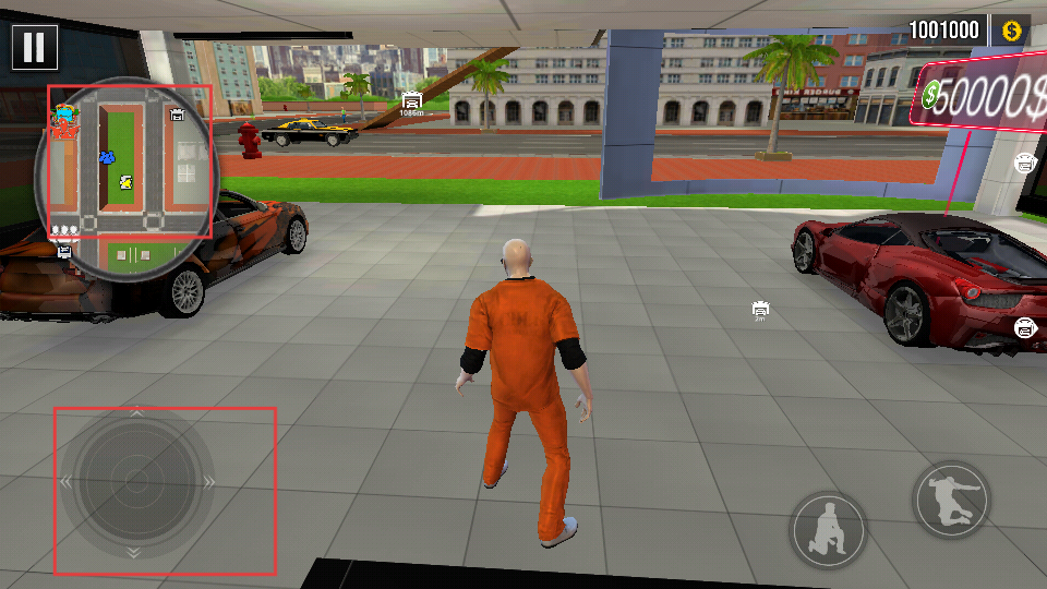 2、通過屏幕左下方的虛擬搖桿操控角色移動,在城市場景中走動,靠近車輛準備駕駛,同時可以查看左上角的小地圖,了解自己的位置和任務目標位置。