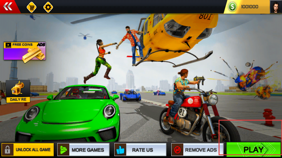 1、玩家下載游戲之后在游戲主界面點擊PLAY綠色按鈕,進入炫酷飛車挑戰游戲,開啟城市飛車冒險。