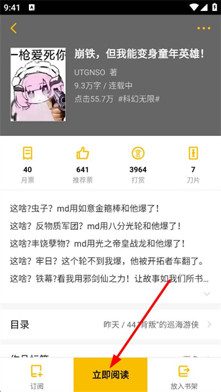2、小說詳情頁,可查看作品字數、熱度等信息,點擊立即閱讀按鈕,就能進入閱讀界面,開始瀏覽小說的具體內容。