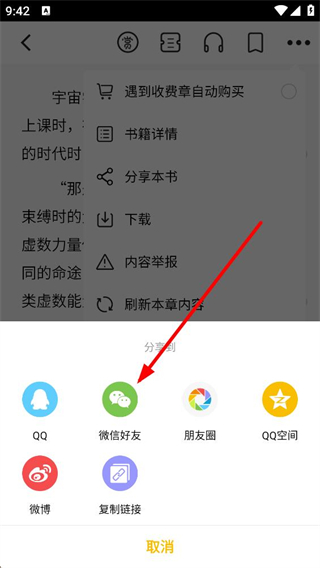 4、閱讀界面打開功能菜單,選擇分享本書選項,可將作品分享至微信好友等平臺,也能復制鏈接完成分享操作。
