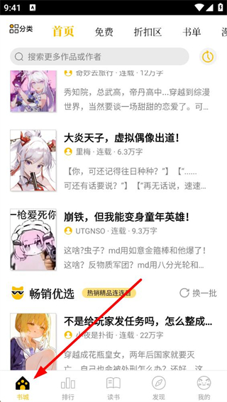 1、進入應用書城頁面,可通過分類免費折扣區等頻道篩選內容,也能直接搜索作品或作者,點擊目標小說即可進入其詳情界面。