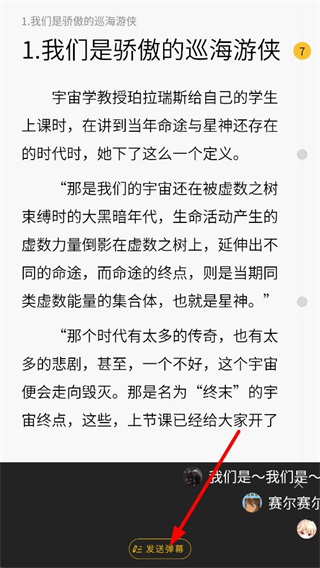 3、進入閱讀界面后,可查看小說章節內容,同時支持發送彈幕與其他讀者互動,還能通過操作欄使用更多閱讀相關功能。