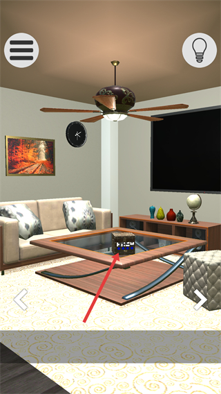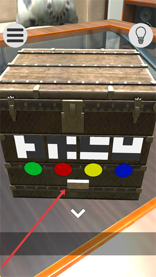 1、進入客廳場景,仔細觀察各處,會發現桌子上有個帶彩色按鈕的箱子,這是需要解開的關鍵物品,開始探索解謎。
