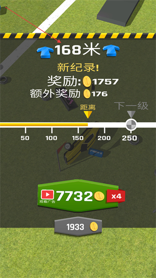 4、汽車停止行駛后同時可領取相應的獎勵金幣,玩家可以選擇觀看廣告獲取多倍金幣,之后點擊下一級繼續挑戰更遠的距離。