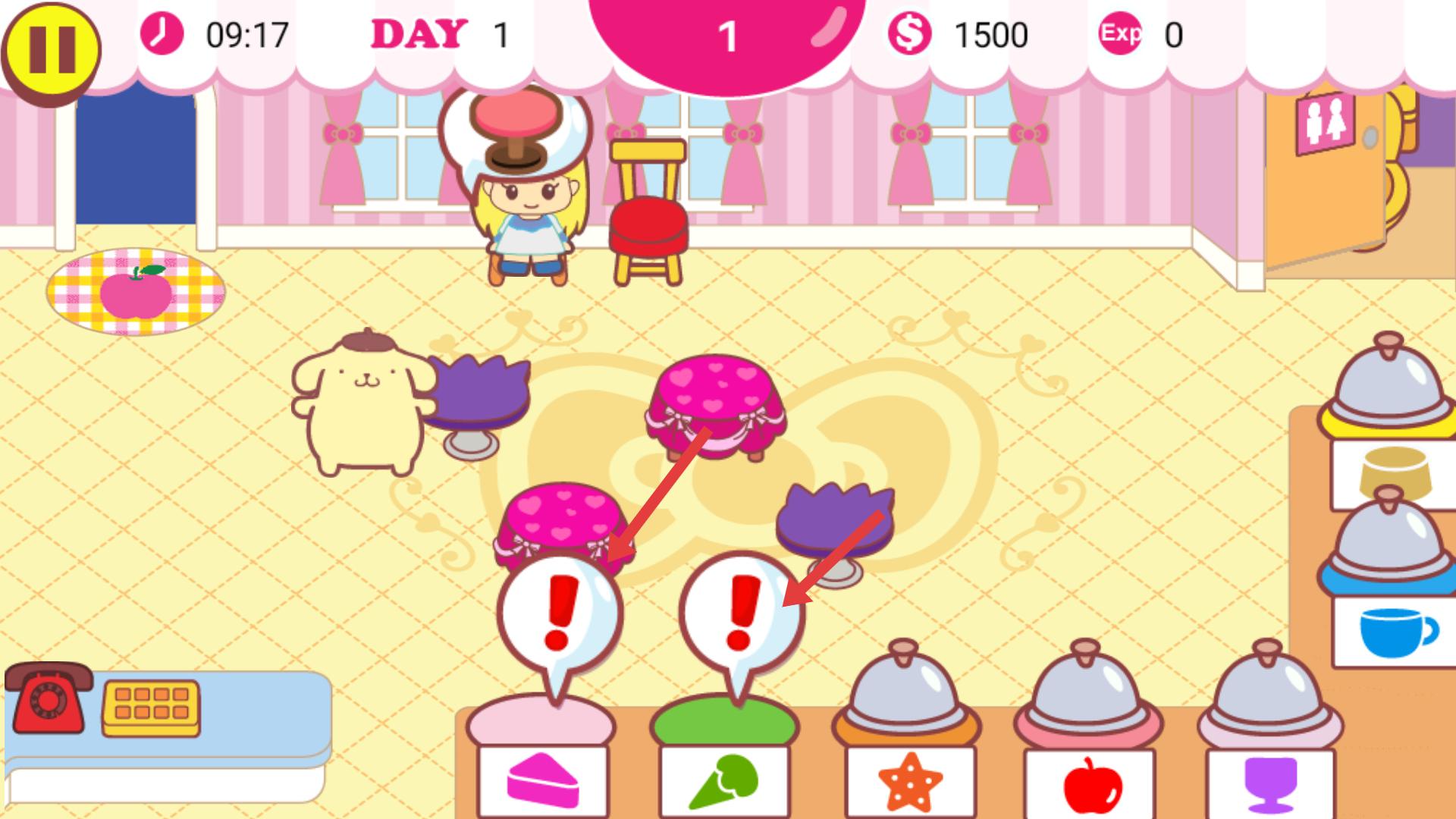 2、進入咖啡館后,注意帶有紅色感嘆號的提示,根據提示為對應的桌位準備指定的食物,滿足顧客需求。