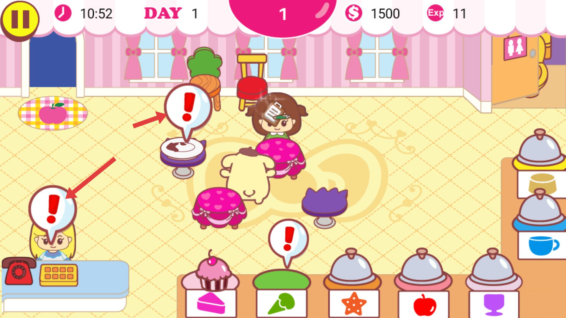 4、隨著顧客增多,會有多個帶有紅色感嘆號的提示,要合理分配時間,依次為不同的桌位和顧客提供對應的食物,積累經驗和收入。