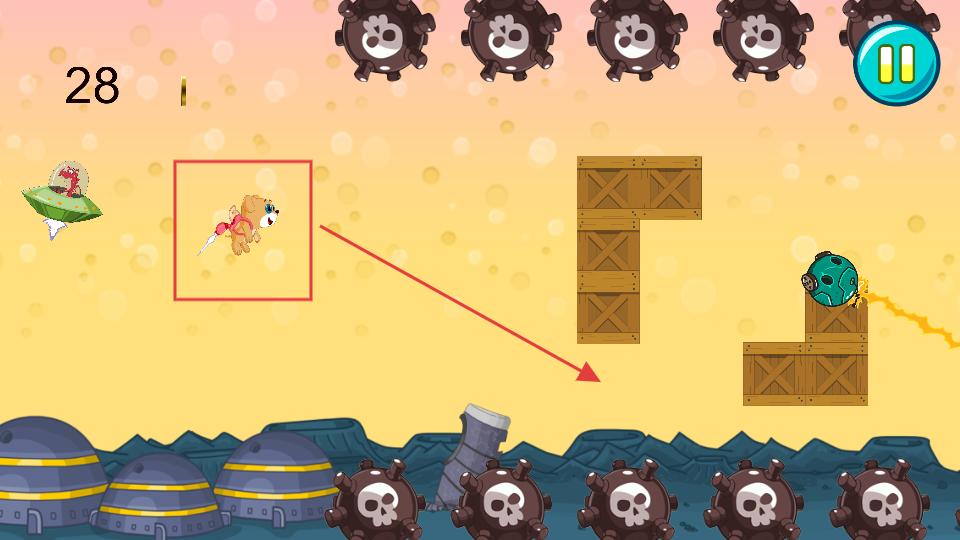 3、持續操控狗狗飛行,靈活躲避如骷髏頭障礙物、敵人發射的攻擊等,盡可能收集更多金幣,提升游戲得分。