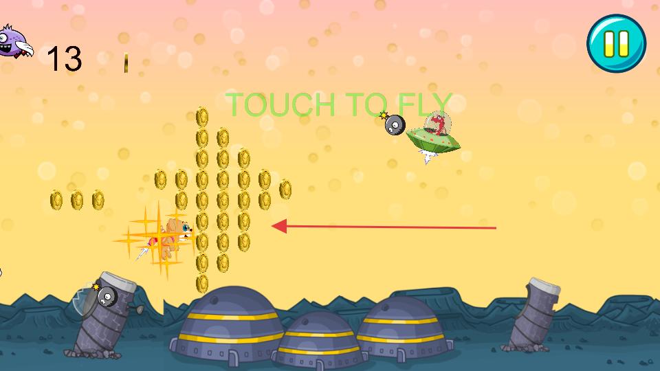 2、在冒險場景中通過點擊屏幕操控狗狗利用噴氣背包飛行,朝著金幣的方向移動,收集金幣,同時注意躲避敵人和障礙物。