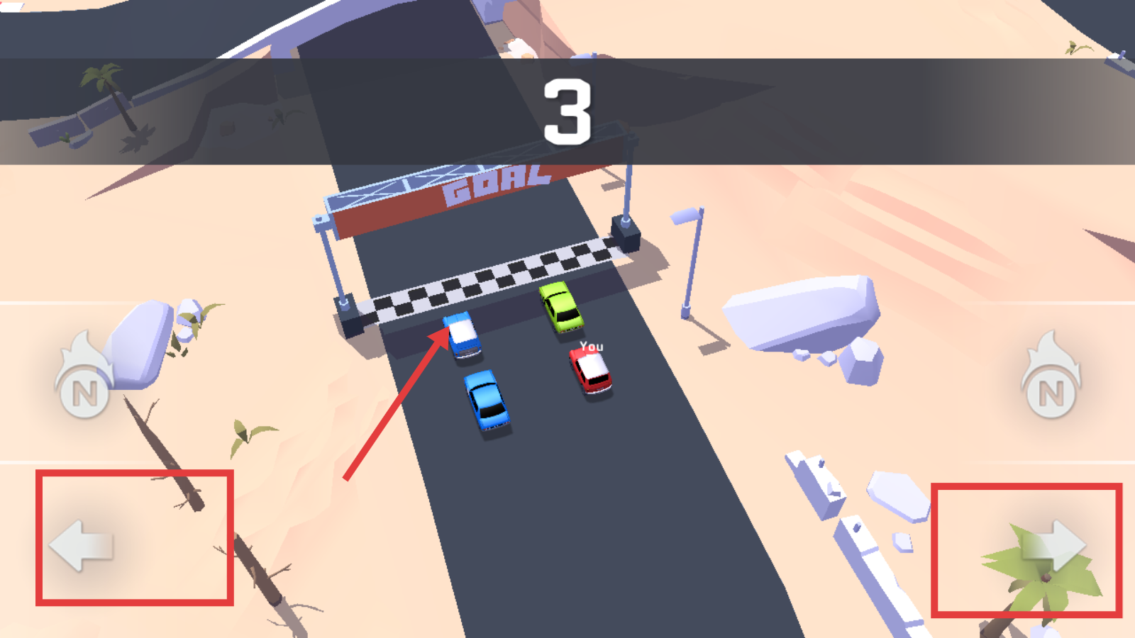 2、在比賽過程中通過屏幕左下角的方向按鈕控制賽車左轉,右下角的方向按鈕控制賽車右轉,靈活操控賽車在賽道上行駛。