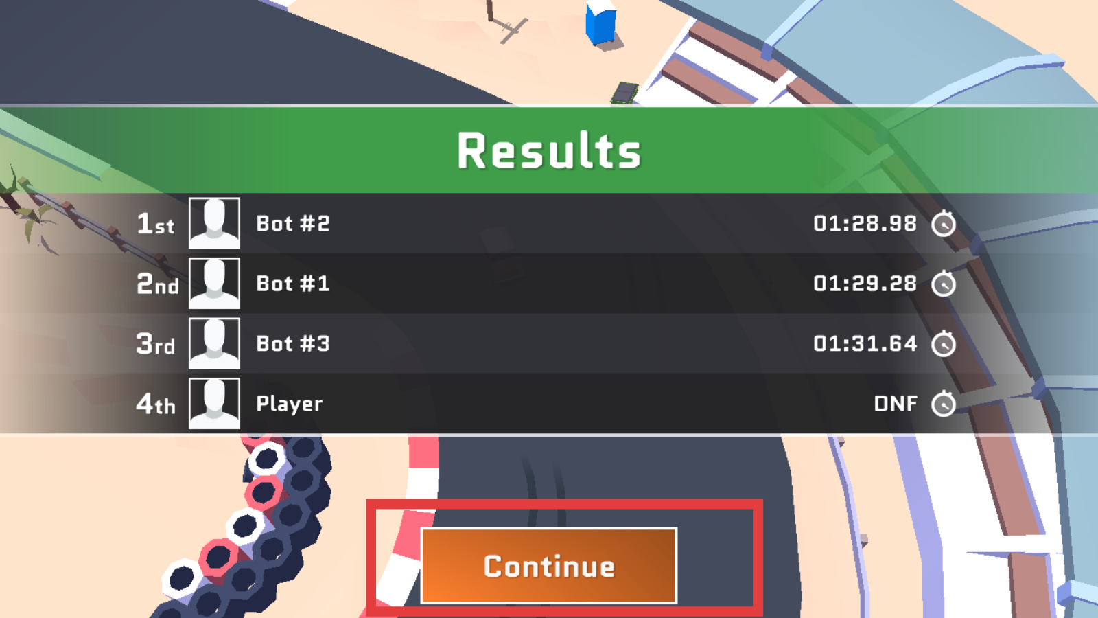 3、比賽結束后,查看比賽結果界面,了解自己的比賽排名和用時等信息,點擊Continue繼續按鈕,可以返回主界面或進入下一場比賽。