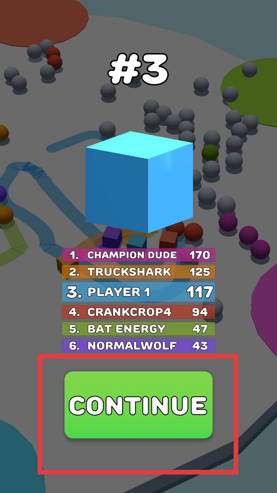 4、游戲結束后,查看排名界面了解自己和其他玩家的分數及排名情況,點擊CONTINUE按鈕可以重新開始一局游戲。