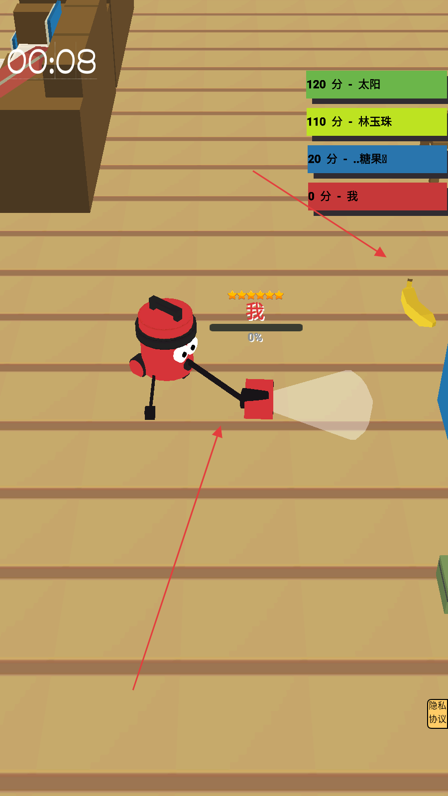 3、在場景中移動時,操控吸塵器靠近并吸起各種垃圾,像香蕉皮等每收集一個垃圾可獲得相應分數。